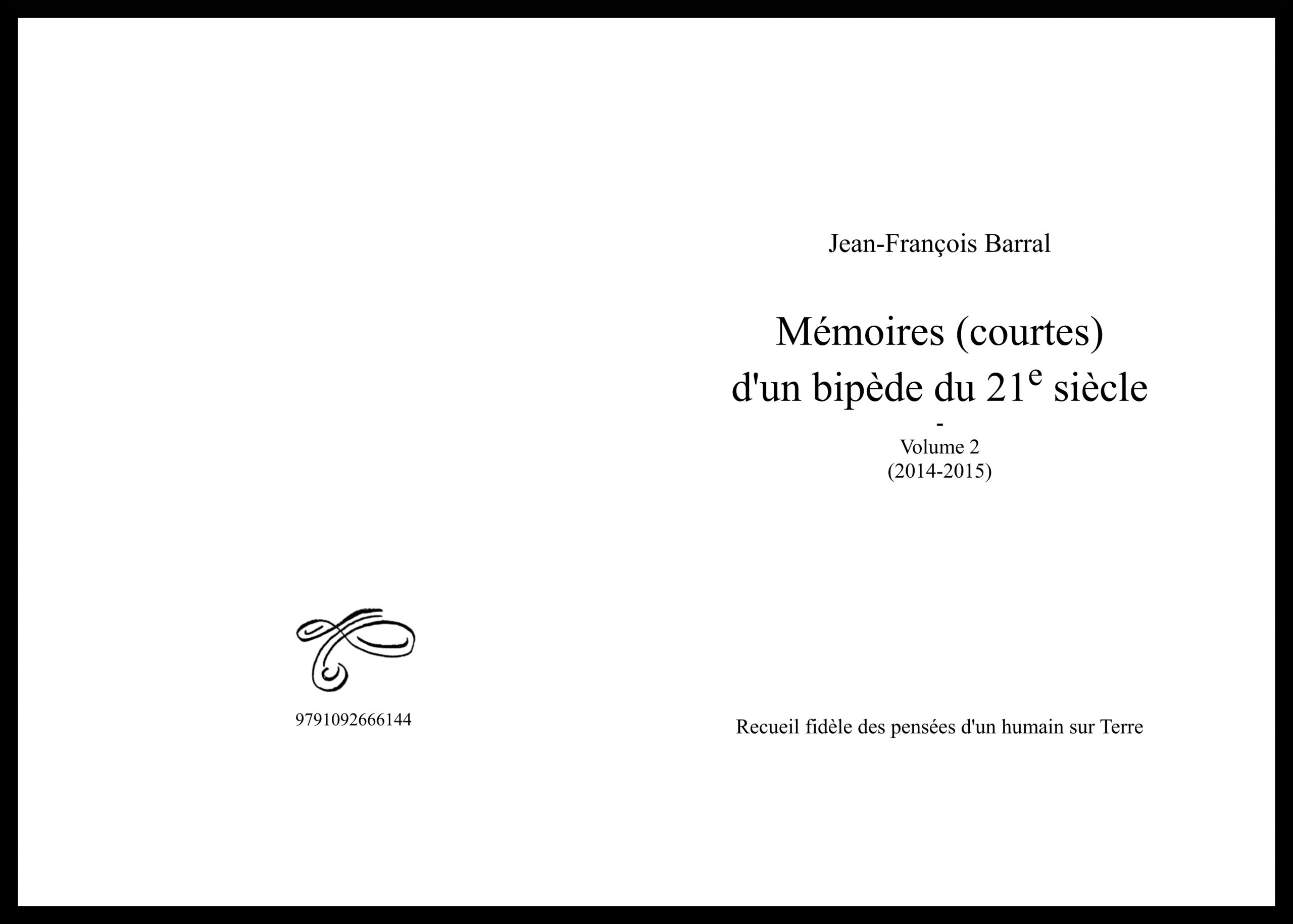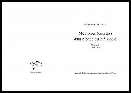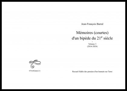 Ils sont composés de 72 pages chacun couvrant les années 2014 et 2015 pour le volume 2 et les années 2016 à 2024 pour le volume 3. Alors vous avez peut-être lu le premier volume de ces « Mémoires » et cela vous a peut-être plu, ou pas… et bien ce sont les suites ! Mais ce n’est pas de la littérature, et ce n’est pas tant un travail d’écriture ; ce n’est qu’un peu de ce qui a pu me traverser l’esprit pendant ma vie, que ce soit pertinent ou pas, ce que je n’ai pas eu la flemme de faire disparaître, en tous cas, de ce que j’ai écrit par-ci par-là.